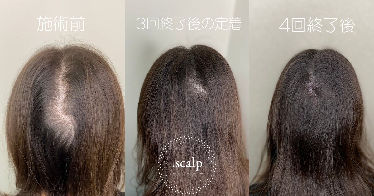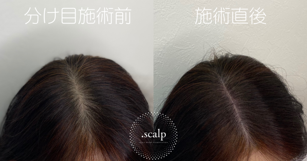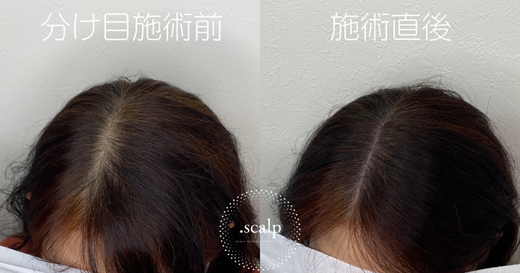頭頂部分け目部分にドットスカルプ。年齢とともに地肌の透け感が気になってきたために、定期的に頭皮をヘナで染めていらっしゃいました。